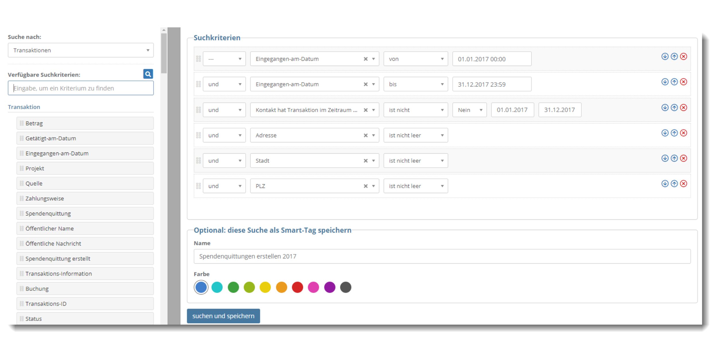 Nutze die Smart-Suche, um die Spenderinnen und Spender zu identifizieren, die eine Spendenquittung erhalten sollen. Einmal eingerichtet, kannst Du die Suche speichern und jedes Jahr wieder verwenden. So findest Du alle relevanten Transaktionen mit einem Klick.