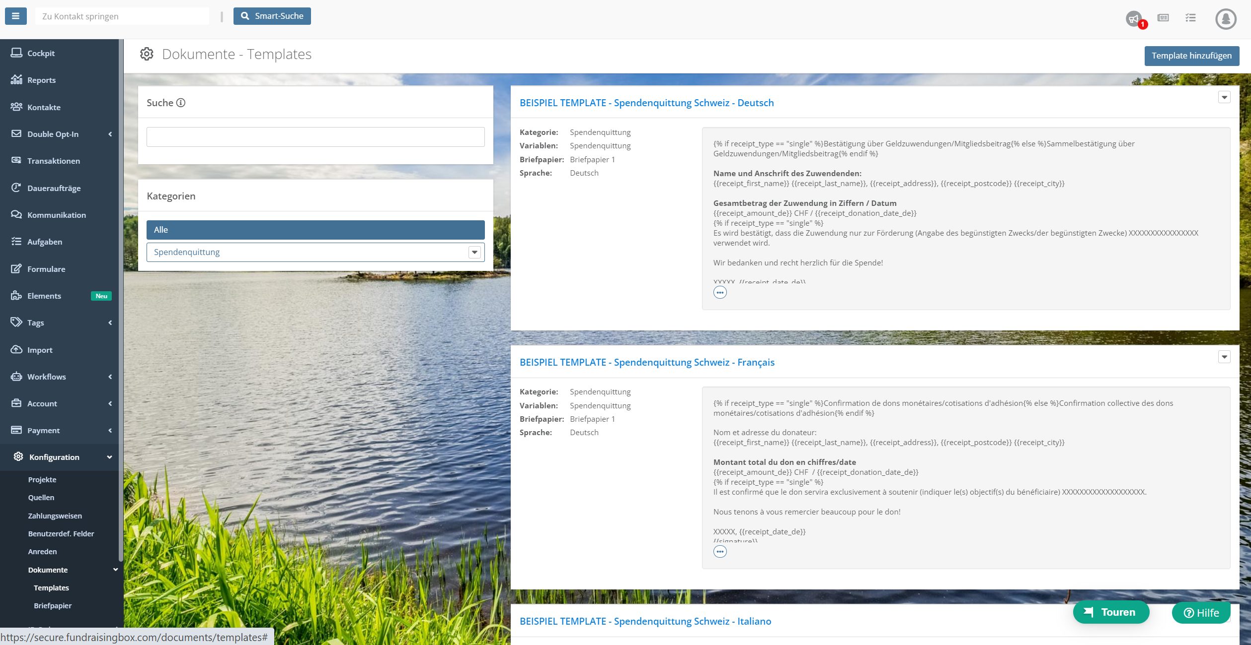 Ein weiterer grosser Vorteil der FundraisingBox ist, dass Du keine eigenen Templates für Spendenquittungen erstellen musst. Für die Schweiz stehen bereits rechtlich konforme Vorlagen zur Verfügung – und das in Deutsch, Italienisch und Französisch. So sparst Du Dir nicht nur Zeit, sondern stellst sicher, dass Deine Spendenbescheinigungen den Schweizer Anforderungen entsprechen. Einfach unter „Dokumente“ das passende Template auswählen und mit den benötigten Variablen wie bei einem Serienbrief personalisieren.
