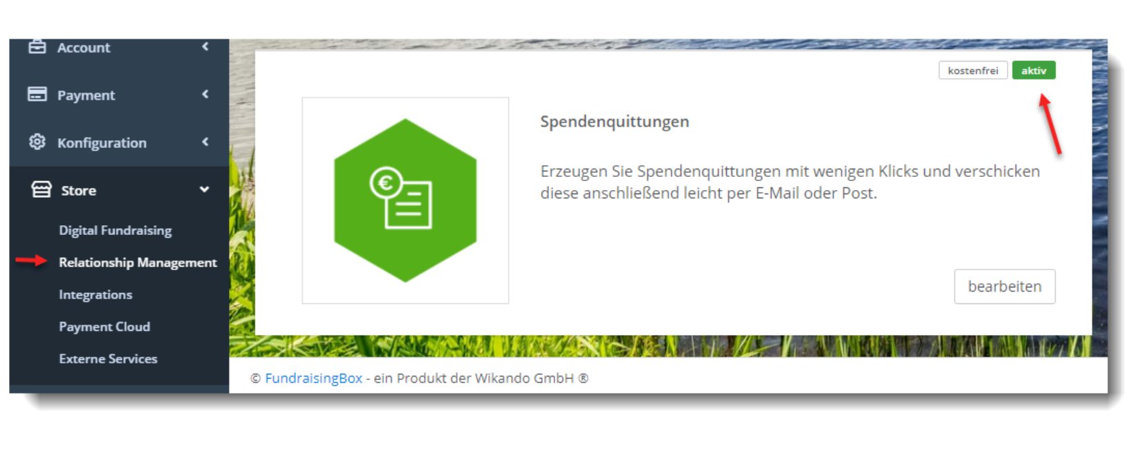 Aktiviere das Spendenquittungs-Feature in der FundraisingBox, indem Du es im Store unter „Relationship Management“ auswählst. Wähle das relevante Datum aus, das für die Spendenquittung berücksichtigt werden soll (Getätigt-am-Datum oder Eingegangen-am-Datum).
