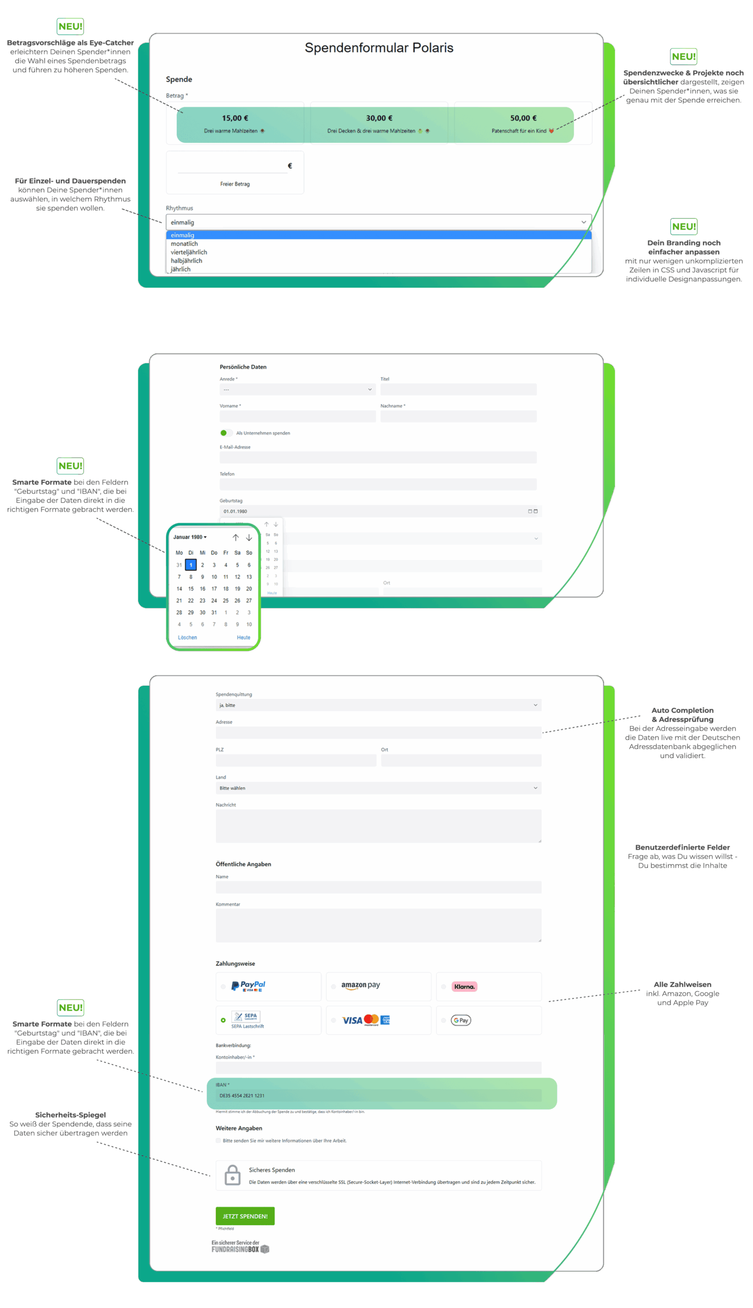 Bei der Eingabe von Datum und IBAN erhalten Deine Spender*innen im neuen Formular eine kleine Unterstützung.